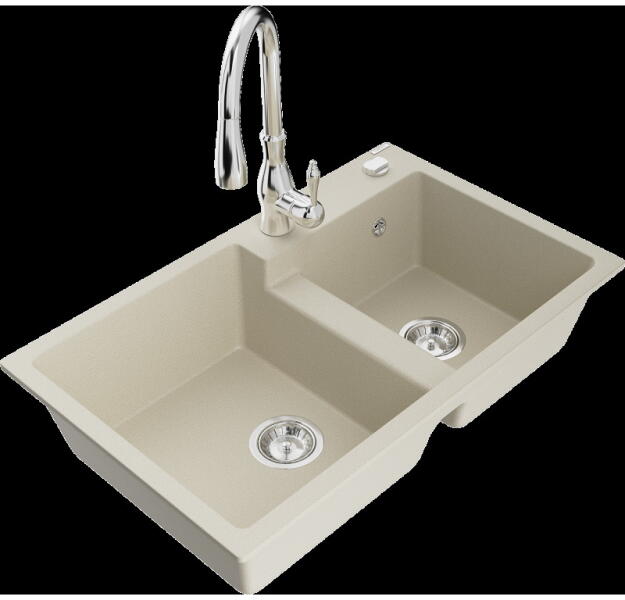 Mario konyhai mosogató: Méretek: 820x436x161 mm Kamra mélysége: 151 mm Kamra méretei: 356x336 mm Lefolyó átmérője: ø90 mm Típus: 2 kamrás Típus: felülről a munkalapba süllyesztve Anyaga: gránit (80% gránit adalékanyag 20% gyanta) Túlfolyó lyuk: igen Lyukak: 2 (1 x mosogató csaptelep, 1 x automatikus leeresztő csavar vezérlés) Nagy ellenállás a karcolásokkal és elszíne