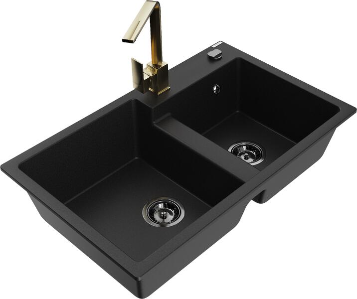 Mexen Tomas, gránit mosogató 800x500x190 mm, 2 kamrás és arany csaptelep Rita, fekete, 6516-77-670300-50-B A konyhai mosogató műszaki adatai: Gyártó: Mexen Sorozat: Tomas Modell: 2-kamrás csepptálca nélkül Felszerelés: munkalapra Fekete szín Felületkezelés: sima Hossza 800 mm Szélesség 500 mm Magasság: 190 mm Kamra mélysége: 180 mm (nagyobb), 180 mm (kisebb) Kamra mérete: 44