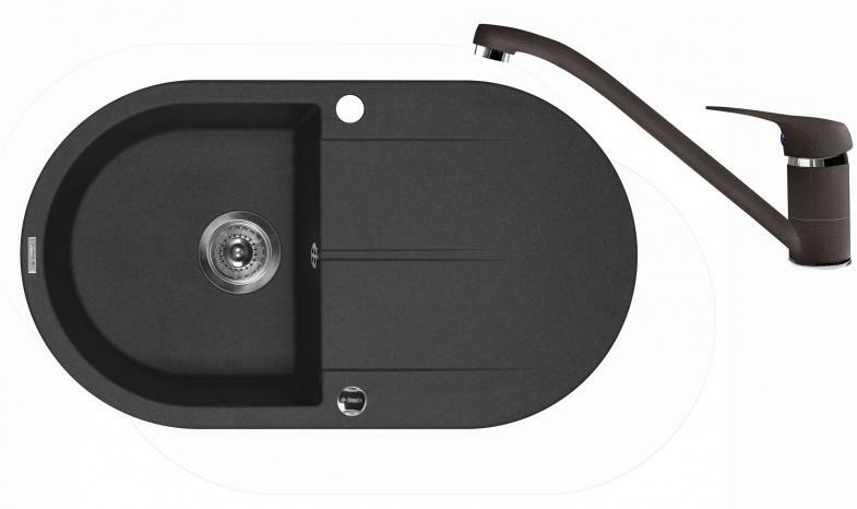 Deante Piva Gránit, ovális mosogató medence 780x440x180mm +csepegtető szifon leeresztővel+ standard csapteleppel FEKETE 06ZQI211B+06BEW260M