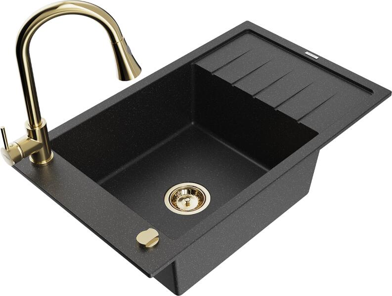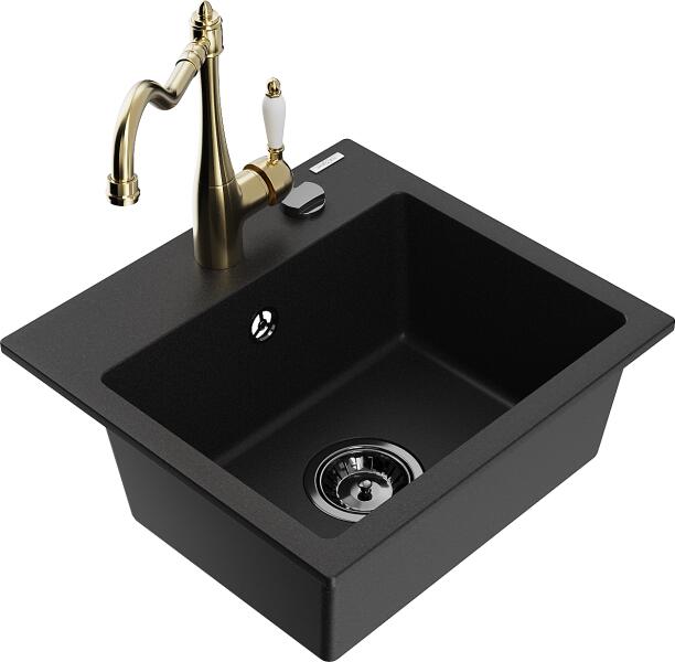 Mexen Milo, gránit mosogató 435x410x171 mm, 1 kamrás és Carla mosogató csaptelep, fekete, 6505-77-670700-50-B Milo konyhai mosogató: Gyártó: Mexen Fekete szín Méretek: 435x410x171 mm Kamra mélysége: 161 mm Kamra méretei: 375x280 mm Lefolyó átmérője: ø90 mm Típus: 1 kamrás Beépítés: felülről a pultba süllyesztve Anyaga: gránit (80% gránit adalékanyag 20% gyanta) Túlfol