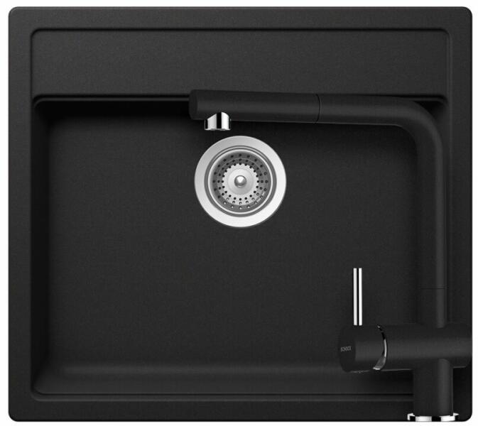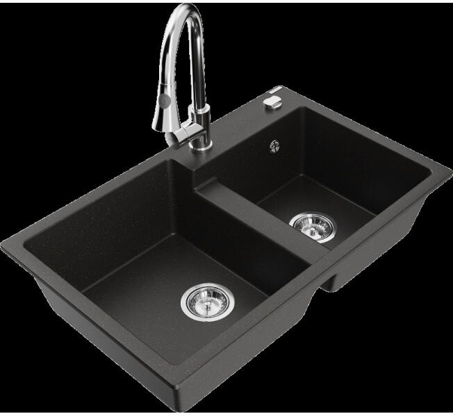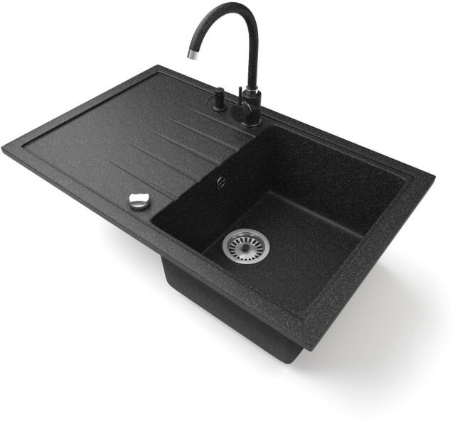NERO Eris gránit mosogatótálca szemcsés fekete színben, ami 78 x 50 cm-es méretével, valamint a 20 cm mély medencével minden igényt kielégít, mégsem foglal sok helyet a konyhai munkafelületből. Markánsan bordázott, de letisztult csepegtető rész és körben vízvető perem kapott helyet. A mosogatón 2 lyuk található, egy a csaptelepnek és egy a mosogatószer adagolónak vagy