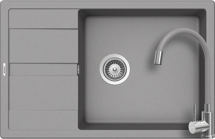 NERO Monza gránit mosogatótálca szürke színben. Kis méretének köszönhetően tökéletesen illik olyan kisebb méretű konyhákba ahol minden centiméter helyre szükség van. Mindössze 57 cm széles, amelyet mélységével kompenzál, így mind a medence, mind a csepegtető rész tökéletesen használható. Modern, karakteresen szögletes formavilág és kiemelkedő anyagvastagság jell