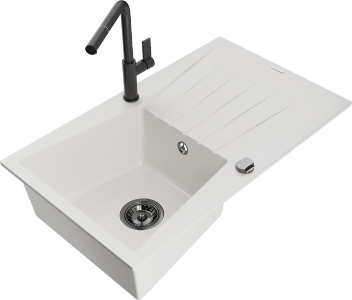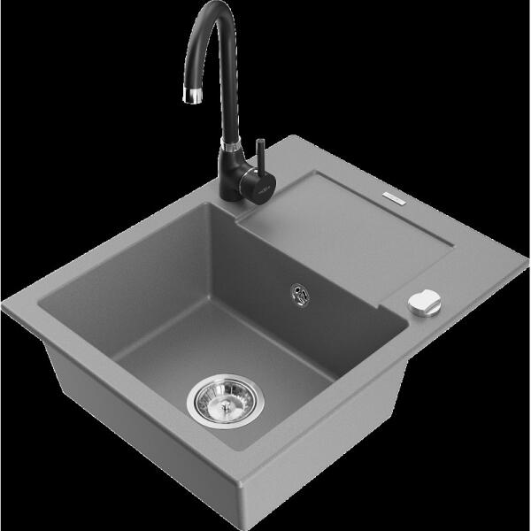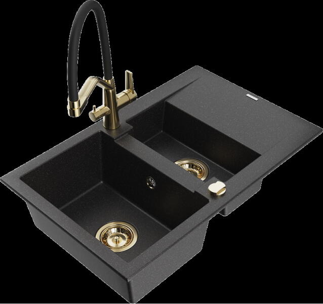 1.5 medencés szemcsés fekete gránit mosogató, ami egyszerre kínálja a másfél medencés mosogatók előnyeit és a helytakarékos megoldást. Teljes készlet, ami tartalmazza a mosogatót, csaptelepet, szifont készletet, és a mosogatószer adagolót. A kisebb medence egyaránt alkalmas gyümölcsmosásra vagy csepegtetőként is használható. Modern formavilág, letisztult, egyenes élek