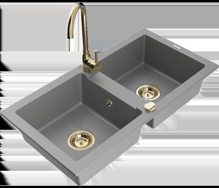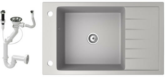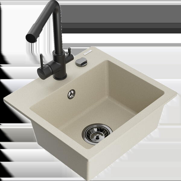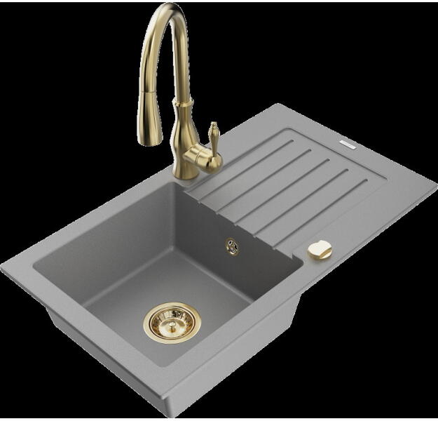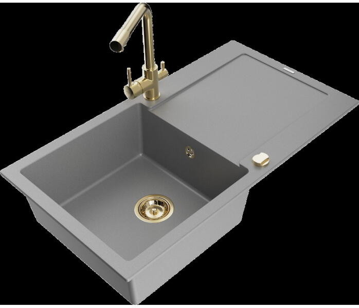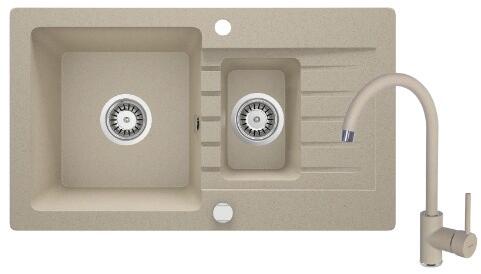 1,5 medencés, gránit mosogató csepegtetővel, csapteleppel|Kivitelezés: homok|Beszerelési mód: süllyesztett|Minimális szekrényszélesség: 600 mm|Hosszúság: 760 mm|Szélesség: 440 mm|Magasság: 160 mm|Mosogatógép-csatlakozással ellátott szerelvényekkel felszerelt mosogató|Automatikus lefolyóelzárással ellátott szifonok|Homok színű csaptelep|Csaptelep típusa: egykaros, keve