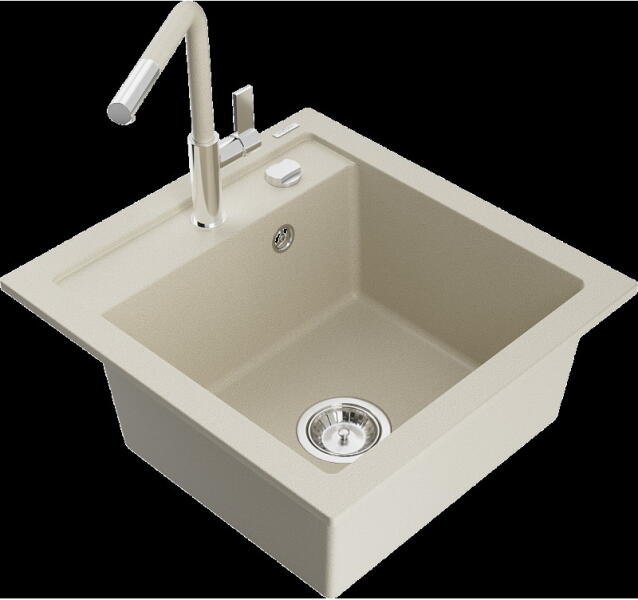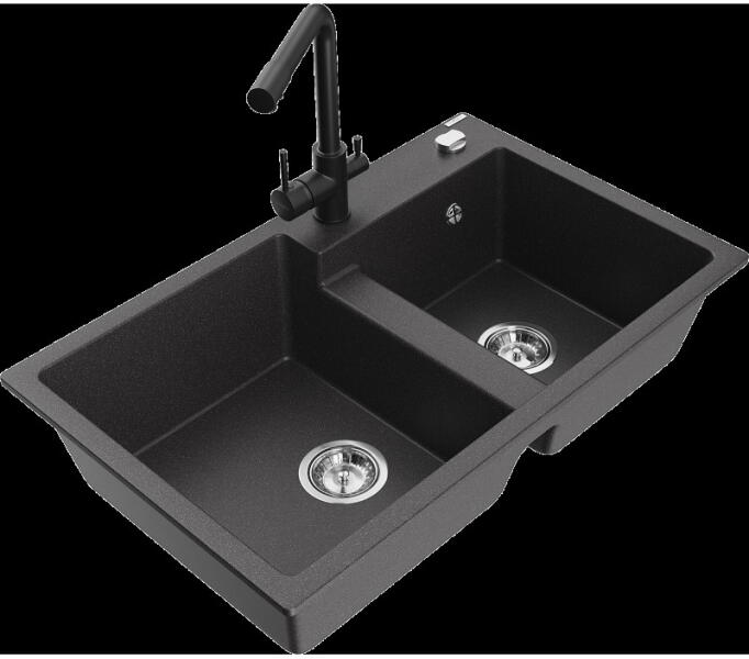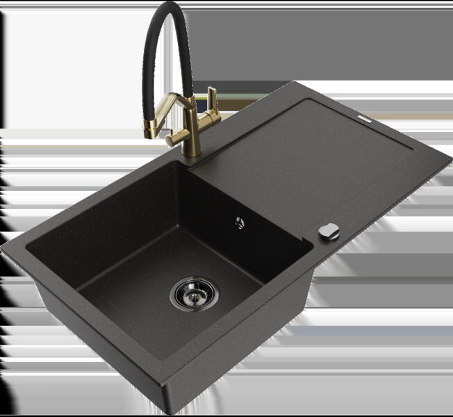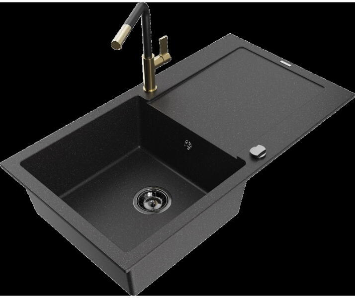 Gyártó: Mexen Sorozat: Bruno + Savita Mosogató: Mérete: 795x495x200 mm Kamra - mélység: 200 mm Kamra méretei: 440x360 mm Kimeneti átmérő: ø90 mm Típus: 1 kamrás csepegtetővel Mosogató típusa: a munkalapba való beágyazáshoz Anyaga: gránit (80% gránit adalékanyag 20% gyanta) Túlfolyó nyílás: Igen Lyukak: 2 (1 lyuk a mosogató csapjához, 1 lyuk az automatikus leeresztő csa