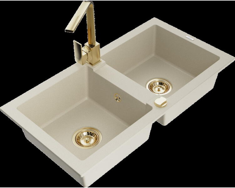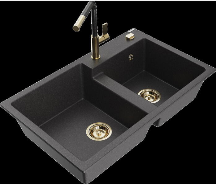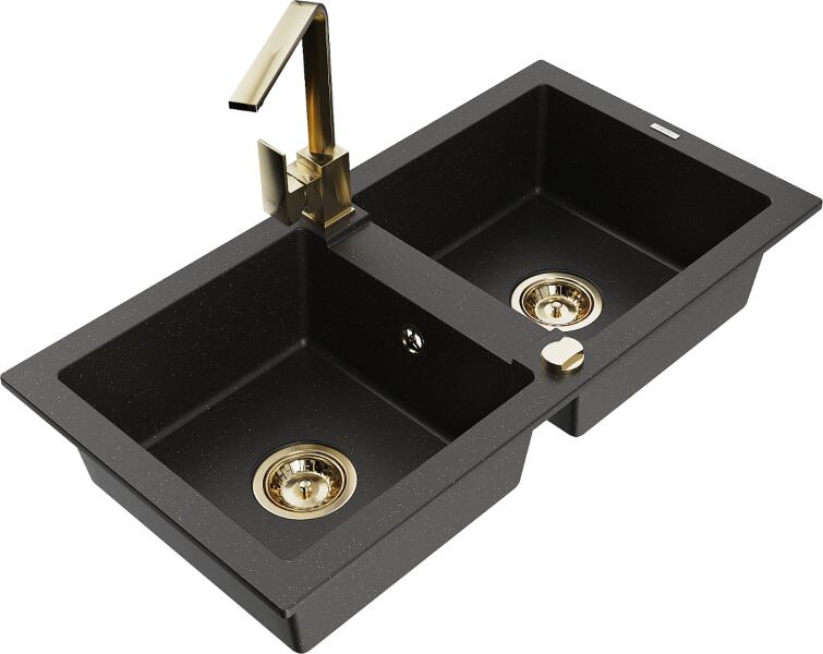 Mexen Mario, gránit mosogató 820x436x161 mm, 2 kamrás, fekete-arany metál arany szifonnal és arany Rita mosogató csapteleppel, 6504-75-670300-50 Gyártó: Mexen Sorozat: Mario Modell: 2 kamrás Szín: fekete - arany metál Felület: sima Felszerelés: munkalapra Hossza 820 mm Szélesség 436 mm Magasság: 161 mm Kamra mélysége: 151 mm Kamra mérete: 356x336 mm Lefolyó átmérője: 90 mm S