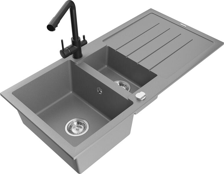 Mexen Andres, gránit mosogató 1000x500x200 mm, 1,5 kamrás + fekete csaptelep Duero, szürke, 6515-71-671600-70 Gyártó: Mexen Sorozat: Andres Modell: 1,5-kamrás lefolyóval Felszerelés: munkalapra Szín: szürke Felületkezelés : sima Hossza 1000 mm Szélesség 500 mm Magasság: 200 mm Kamra mélysége: 190 mm (nagyobb), 115 mm (kisebb) Kamra mérete: 430x330 mm (nagyobb), 340x170 mm (kiseb