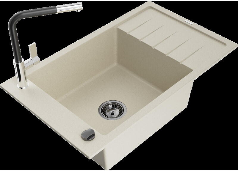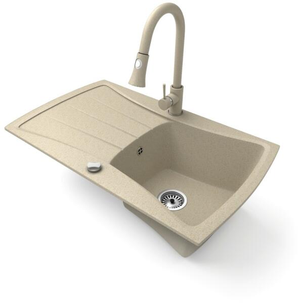 NERO Venezia gránit mosogató homokbézs színben. Egyedi és különleges formával tervezett egymedencés mosogató, kellően nagyméretű csepegtető résszel. A velencei gondolákat idéző, harmonikusan kialakított ívekkel a konyha esztétikus része, emellett anyagvastagságának köszönhetően rendkívül masszív konsktrukció. A mosogatón 2 lyuk található, egy a csaptelepnek és eg