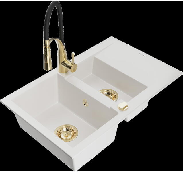 Mexen Tomas, gránit mosogató 800x500x190 mm, 2 kamrás és arany Telma csaptelep, szürke, 6516-71-670200-50 A konyhai mosogató műszaki adatai: Gyártó: Mexen Sorozat: Tomas Modell: 2-kamrás csepptálca nélkül Felszerelés: munkalapra Szín: szürke Felület: sima Hossza 800 mm Szélesség 500 mm Magasság: 190 mm Kamra mélysége: 180 mm (nagyobb), 180 mm (kisebb) Kamra mérete: 440x387