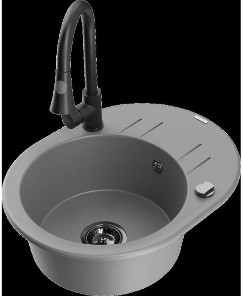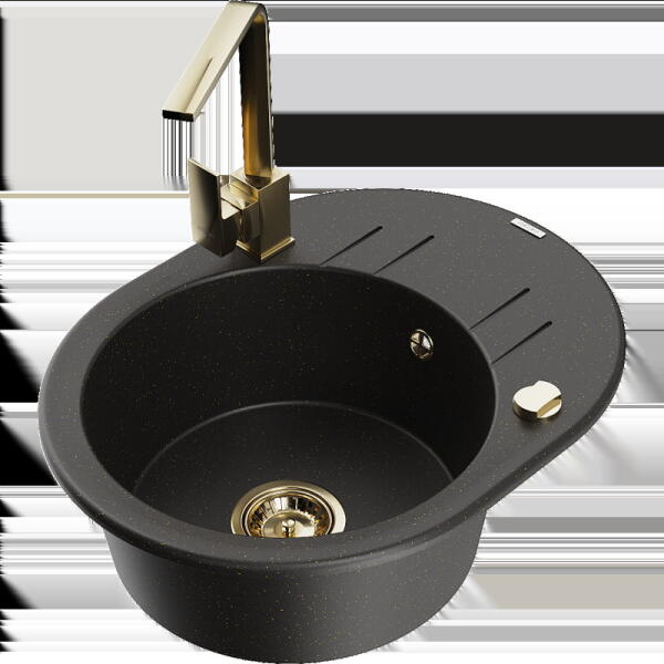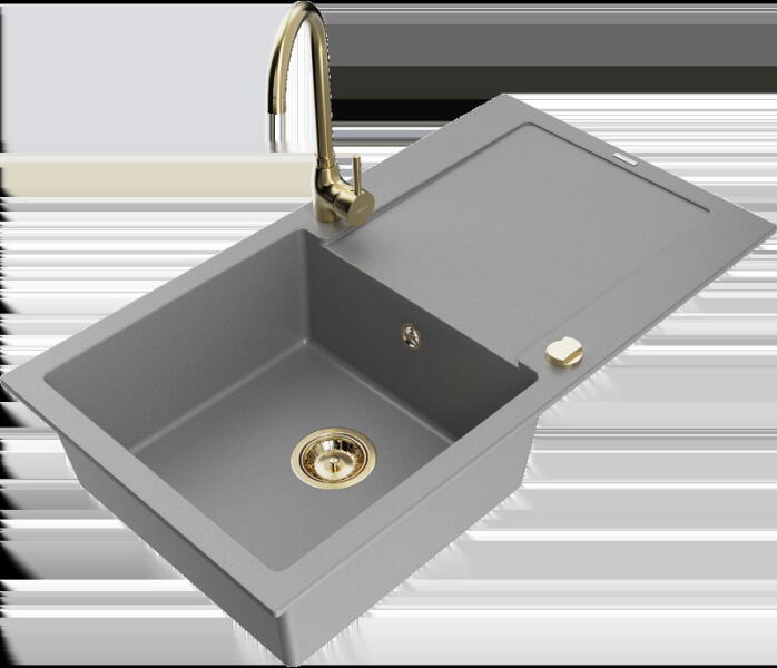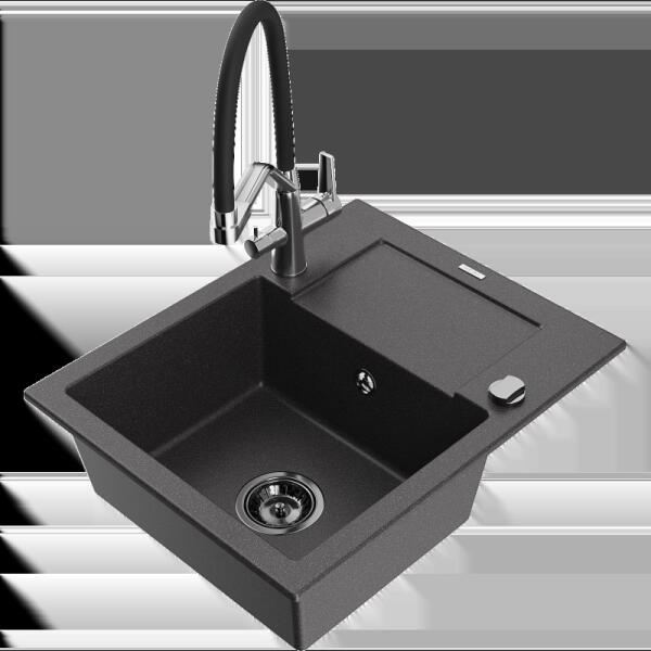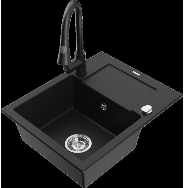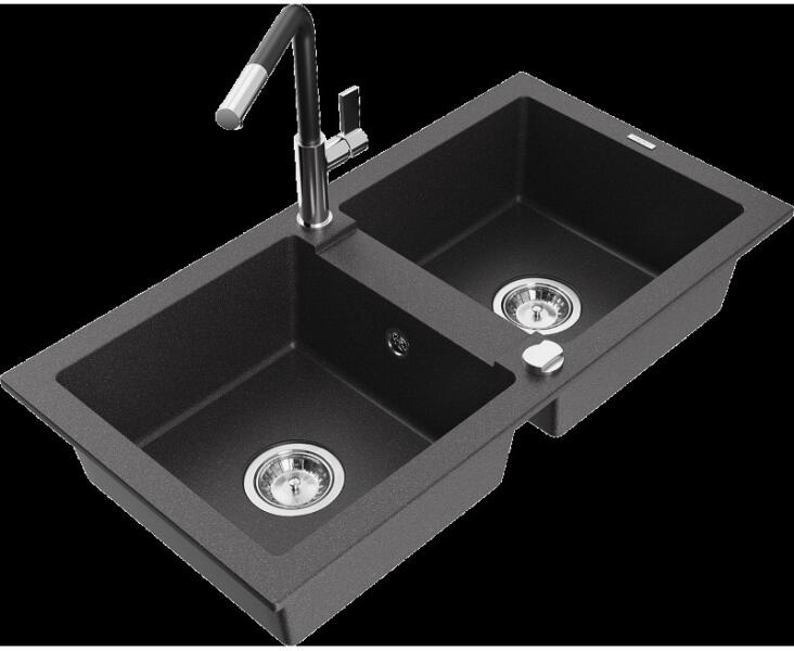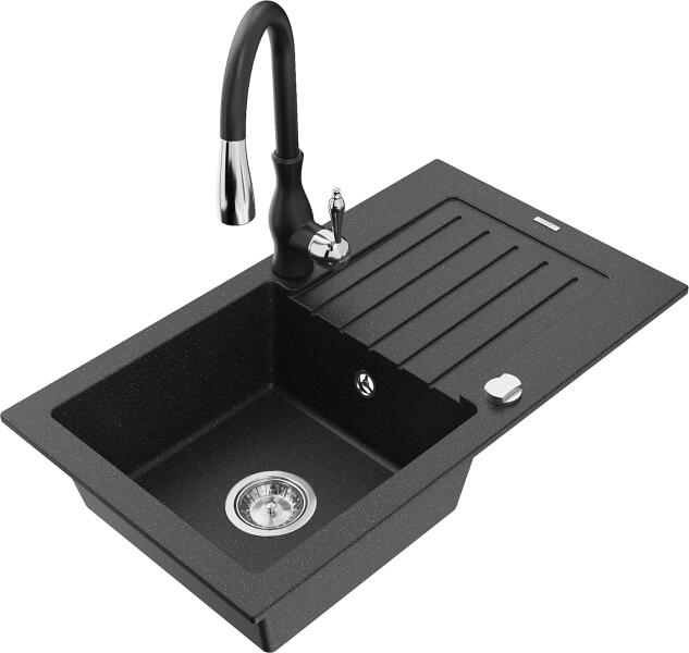 Mexen Pablo, gránit mosogató 752x436x161 mm, 1 kamrás és Savita mosogató csaptelep, fekete-ezüst metál, 6510-73-672601-70 Gyártó: Mexen Sorozat: Pablo Méretek: 752x436x161 mm Kamra mélysége: 151 mm Kamra méretei: 356x332 mm Lefolyó átmérője: ø90 mm Szín: fekete-ezüst metál Típus: 1 kamrás csepegtetővel Típus: a pultba süllyesztve Anyaga: gránit (80% gránit adalékanyag