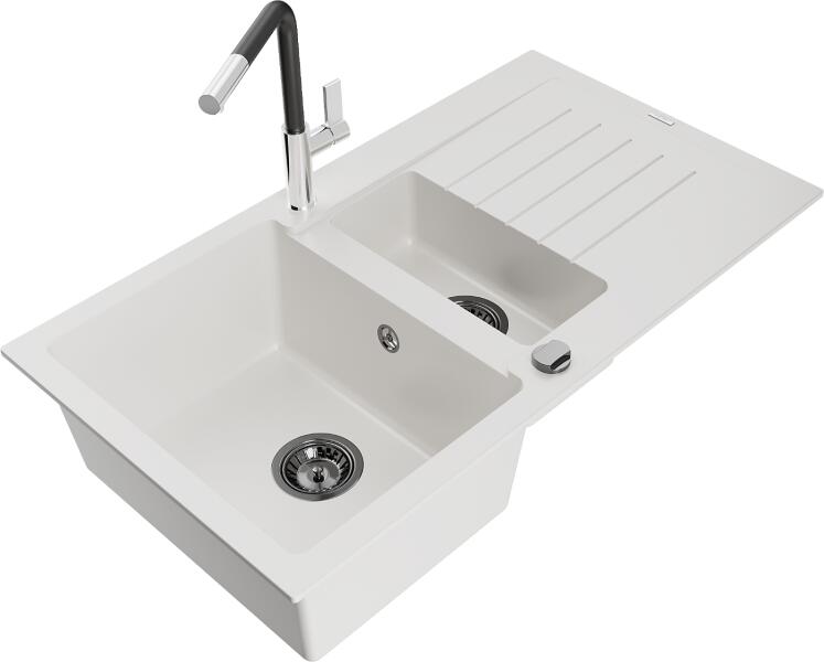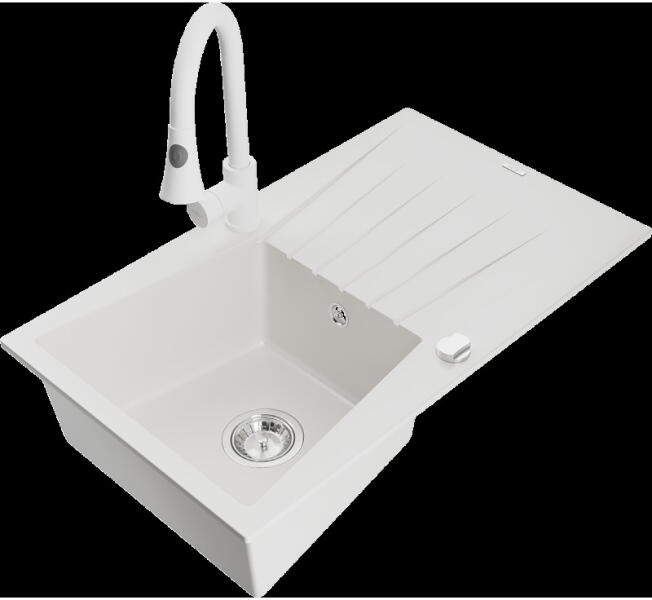Matias konyhai mosogató: Gyártó: Mexen Sorozat: Matias Modell: 1,5-kamrás lefolyóval Beépítés: felülről a munkalapba való beágyazáshoz Hossz: 900 mm Szélesség: 505 mm Magasság: 200 mm Kamra mélysége: 180 mm (nagyobb), 115 mm (kisebb) Kamra mérete: 435x335 mm (nagyobb), 345x150 mm (kisebb) Lefolyó átmérője: 90 mm Szifon + automatikus leeresztő csavar Anyaga: gránit (80% gr