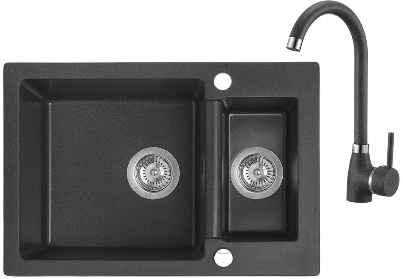 Laveo Celia, 1,5 kamrás gránit mosogató 650x440x195 mm + mosogató csaptelep U alakú kifolyóval, fekete, LAV-SJCA730T Gyártó: Laveo Sorozat: Celia Típus: 1,5 kamrás gránit mosogató + magas mosogató csaptelep Fekete szín Felület: matt, finom kőszerkezet Hossz: 650 mm Szélesség: 440 mm Magasság: 195 mm A nagy kamra mélysége: 170 mm / a kisebb kamra mélysége: 130 mm Min. széles