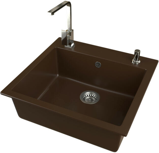 EOS Como gránit mosogató matt sötétbarna színben, amely egyszerre modern, praktikus és bármilyen méretű edény könnyen kezelhető benne. 54.5 cm-es szélesség, ami egyben helytakarékos megoldást is nyújt. Rendkívül letisztult és időtálló formavilág jellemzi, stílustól függetlenül bármely konyha nagyszerű eleme. A lyukak a mosogató medence mögötti perem részen találh