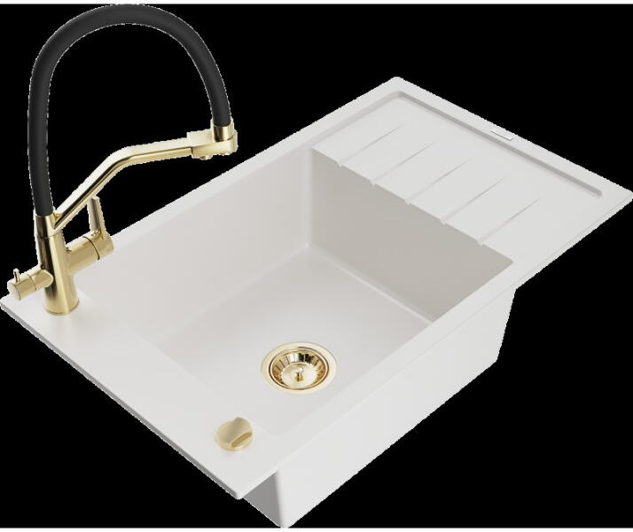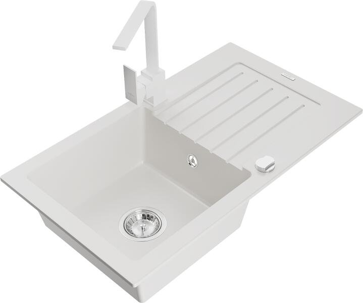 Mexen Pablo, gránit mosogató 752x436x161 mm, 1 kamrás és fehér Rita csaptelep, fehér, 6510-20-670300-20 Gyártó: Mexen Sorozat: Pablo Mérete: 752x436x161 mm Kamra mélysége: 151 mm Kamra méretei: 356x332 mm Lefolyó átmérője: ø90 mm Fehér szín Típus: 1 kamrás csepegtetővel Típus: az asztallapba ágyazva Anyaga: gránit (80% gránit adalékanyag 20% gyanta) Túlfolyó lyuk: ige