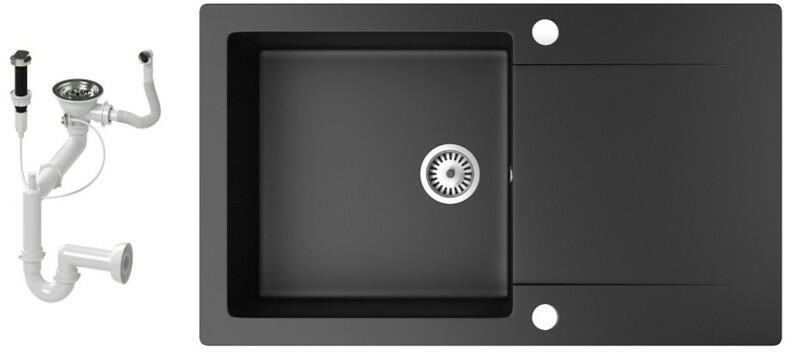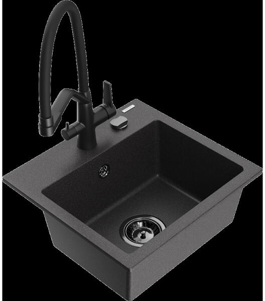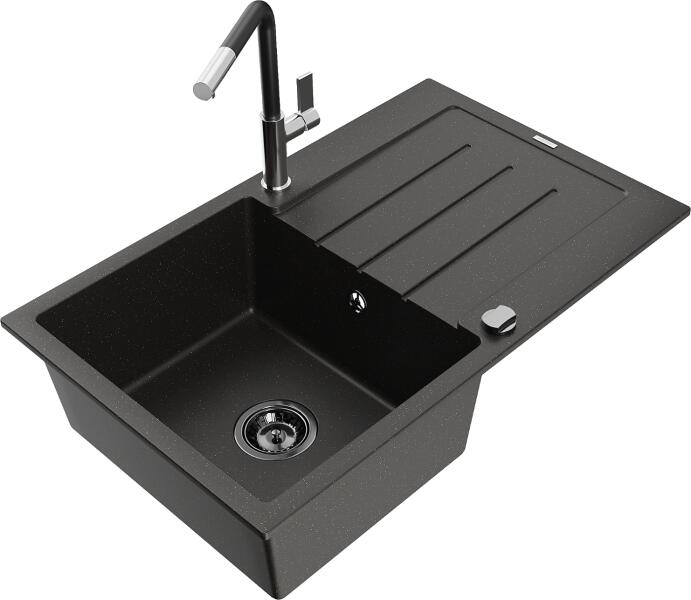 Mexen Leo, gránit mosogató 900x500x190 mm, 1 kamrás és Aster mosogató csaptelep, fekete, 6501-77-73450-07 Gyártó: Mexen Sorozat: Leo Modell: 1-kamrás s csepegtetővel Fekete szín Felület: sima Beépítés: felülről a munkalapba süllyesztve Hossza 900 mm Szélesség 500 mm Magasság: 190 mm Kamra mélysége: 180 mm Kamra mérete: 430x415 mm 500 mm-es méretű szekrényekhez Szifon + au