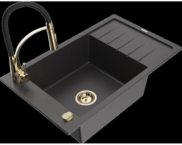 NERO Gold gránit mosogató matt fekete színben. Praktikus kialakítású egymedencés mosogató, kellő méretű csepegtető résszel. Modern letisztult formájával egy modern konyha tökéletes része lehet. Különlegessége hogy a csepegtető rész nem bordázott, így a minimál stílusú konyhákba is nagyszerű választás. A mosogatón 2 lyuk található ezáltal a mosogató lehet jobb v