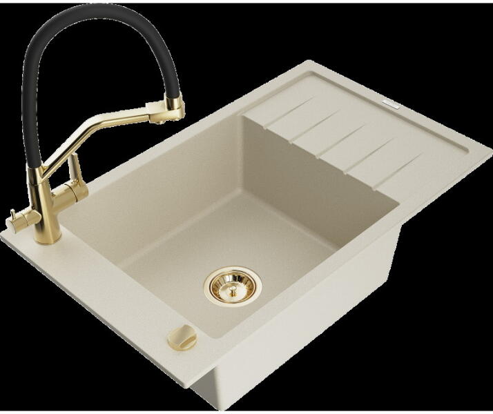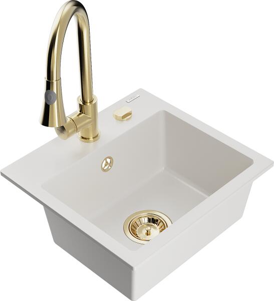 Mexen Diego, 1 kamrás gránit mosogató 488x488x167 mm, Duero arany csaptelep, bézs, 6512-69-671600-50 Gyártó: Mexen Sorozat: Diego Modell: 1 kamrás Felszerelés: munkalapra Szín: bézs Felület típusa : sima Hossza 488 mm Szélesség 488 mm Magasság: 167 mm Kamra mélysége: 157 mm Kamra mérete: 406 mm Lefolyó átmérője: 90 mm Szifon + automatikus leeresztő Anyaga: gránit (80% grá