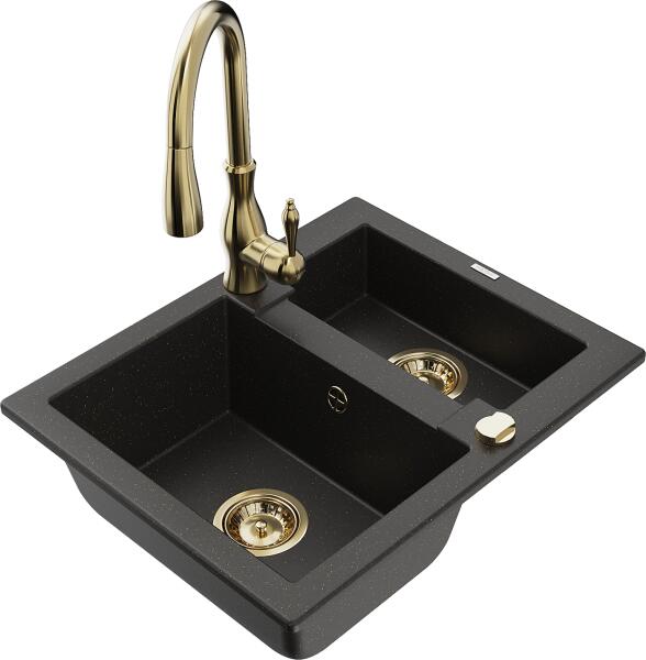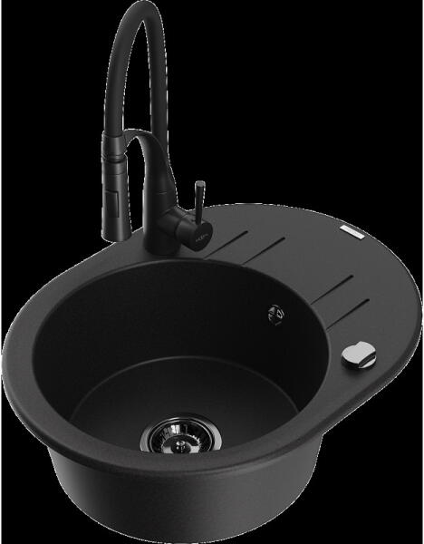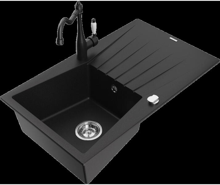 Mexen Vito, 1 kamrás gránit mosogató 520x490x210 mm, fekete matt Telma csaptelep, fekete, 6503-77-670200-70-B Mosogató: Mérete: 520x490x210 mm Kamra mélysége: 200 mm Kamra méretei: 410x360 mm Lefolyó átmérője: ø90 mm Típus: 1 kamrás Típus: Az asztallapba süllyesztett Fekete szín Anyaga: gránit (80% gránit adalékanyag 20% gyanta) Túlfolyó nyílás: Igen Lyukak: (akkumulátor,
