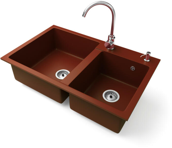 NERO Palazzo gránit mosogatótálca piros színben króm csapteleppel és adagolóval. A kétmedencés mosogatótálcák 21. századi csúcsmodellje, ami két nagyméretű medencéjével és különleges kialakításával minden konyha tökéletes eleme lehet. Az asszimetrikus kialakításnak köszönhetően a kisebb medence fölött egy praktikus perem helyezkedik el, ahol helyet kapott a csapte