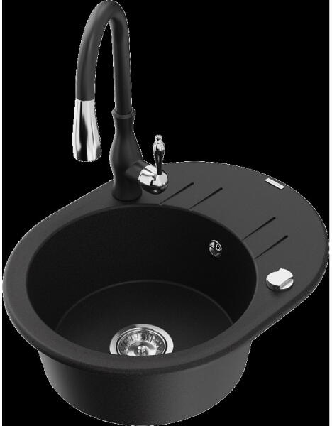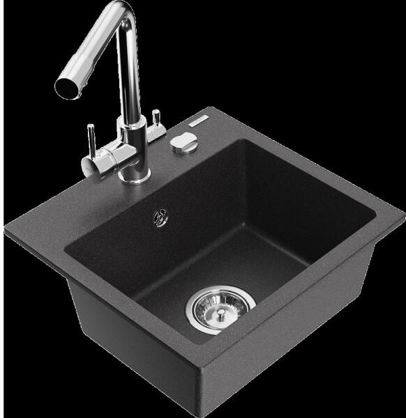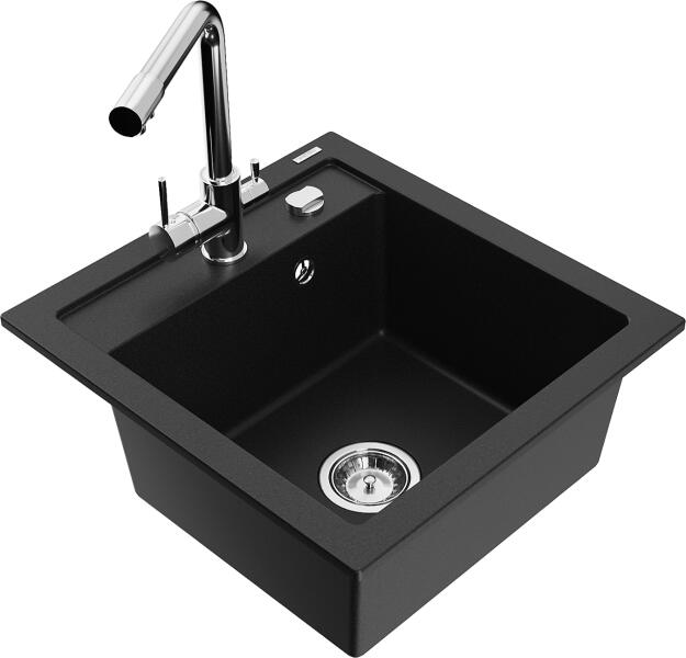 Mexen Vito, 1 kamrás gránit mosogató 520x490x210 mm, Duero króm csaptelep, fekete, 6503-77-671600-00 Mosogató: Mérete: 520x490x210 mm Kamra mélysége: 200 mm Kamra méretei: 410x360 mm Lefolyó átmérője: ø90 mm Típus: 1 kamrás Típus: Az asztallapba süllyesztett Fekete szín Anyaga: gránit (80% gránit adalékanyag 20% gyanta) Túlfolyó nyílás: Igen Lyukak: (akkumulátor, gép) 2
