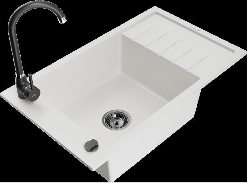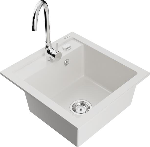 Mexen Vito, 1 kamrás gránit mosogató és Telma konyhai csaptelep, fehér, 6503-20-670200-00 Mosogató: Termékkód: 6503521000-20 Mérete: 520x490x210 mm Kamra mélysége: 200 mm Kamra méretei: 410x360 mm Lefolyó átmérője: ø90 mm Típus: 1 kamrás Típus: Az asztallapba süllyesztett Fehér szín Anyaga: gránit (80% gránit adalékanyag 20% gyanta) Túlfolyó nyílás: Igen Lyukak: (csap