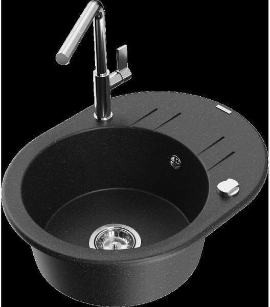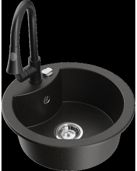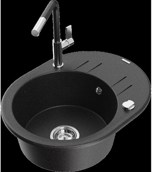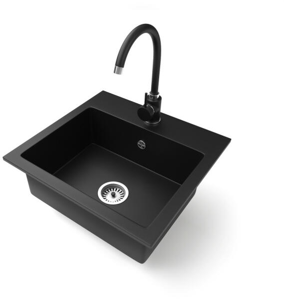 Mexen Enzo, gránit mosogató 576x465x174 mm, 1 kamrás, fekete matt Duero csaptelep, fekete - ezüst metál, 6506-73-671600-70 Gyártó: Mexen Sorozat: Enzo Modell: 1 kamrás, rövid csepegtetővel Hossza 576 mm Szélesség 465 mm Magasság: 174 mm Szín: fekete - ezüst metál Kamra mélysége: 164 mm Kamra mérete: 395x320 mm Szifon + automatikus leeresztő csavar Anyaga: gránit (80% gránit -
