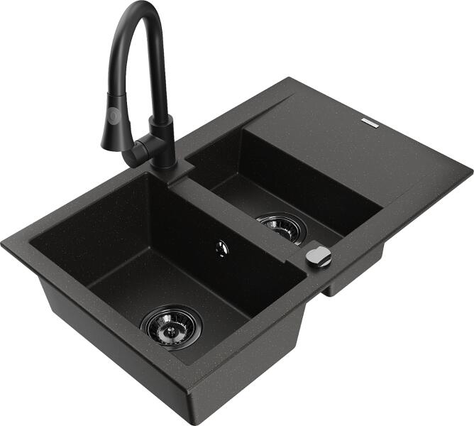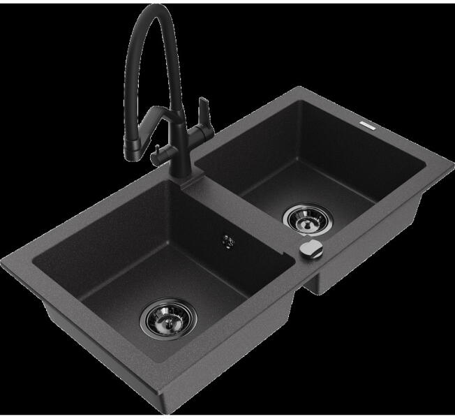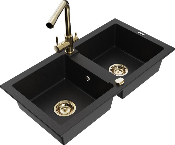 Mexen Mario, 2 kamrás gránit mosogató 820x436x161 mm és Duero arany mosogató csaptelep, fekete, 6504-77-671600-50 Gyártó: Mexen Sorozat: Mario Termékkód: 6504822000-77 Fekete szín Mérete: 820x436x161 mm Kamra mélysége: 151 mm Kamra méretei: 356x336 mm Lefolyó átmérője: ø90 mm Típus: 2 kamrás Típus: a pultba süllyesztve Anyaga: gránit (80% gránit adalékanyag 20% gyanta) T
