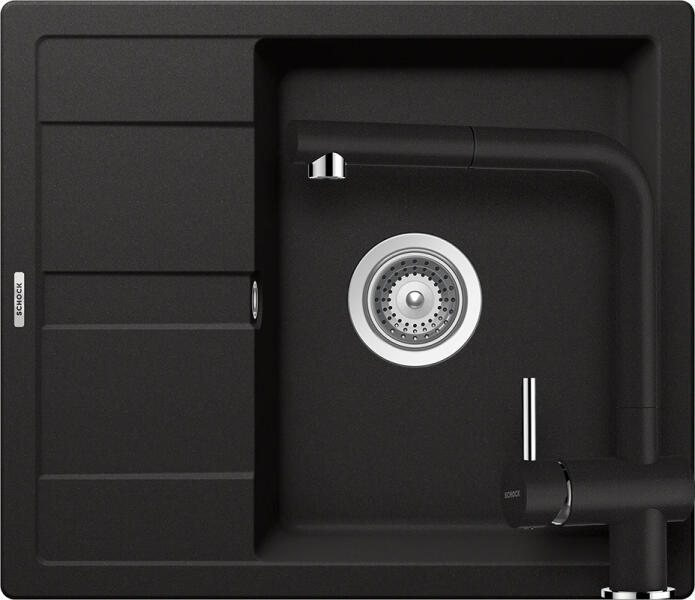 Schock Ronda D-100 konyhai mosogatótálca Cristalite Nero 580 x 500 mm, gránit, megfordítható, hagyományos beépítés, fekete munkalapba beépíthető, egymedencés, megfordítható, csepegtetővel ellátott, ideálisan illeszkedik a minimum 45 cm-es alsószekrényhez. A csaptelep helye előre elkészített, könnyedén áttörhető. A csomagban találja a használati útmutatót, amely rés