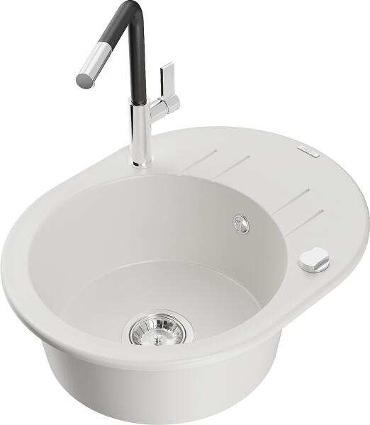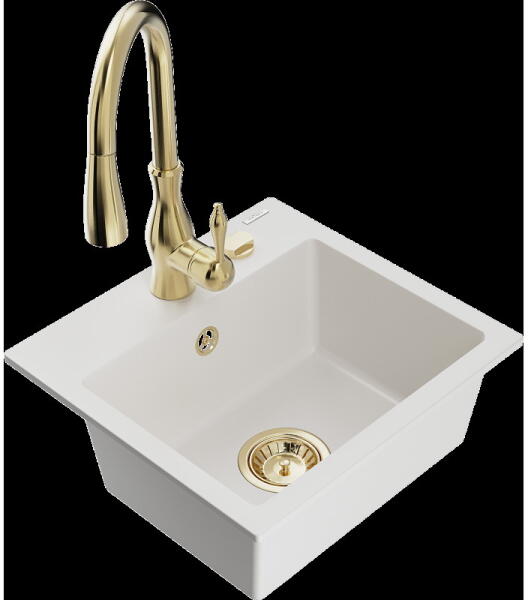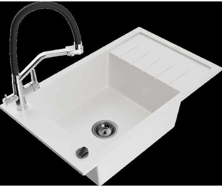 Mexen Mario, gránit mosogató 820x436x161 mm, 2 kamrás és Aster mosogató csaptelep, fehér, 6504-20-73450-57-G Mosogató: Gyártó: Mexen Sorozat: Mario Fehér szín Méretek: 820x436x161 mm Kamra mélysége: 151 mm Kamra méretei: 356x336 mm Lefolyó átmérője: ø90 mm Típus: 2 kamrás Típus: felülről a munkalapba való beágyazáshoz Anyaga: gránit (80% gránit adalékanyag 20% gyanta