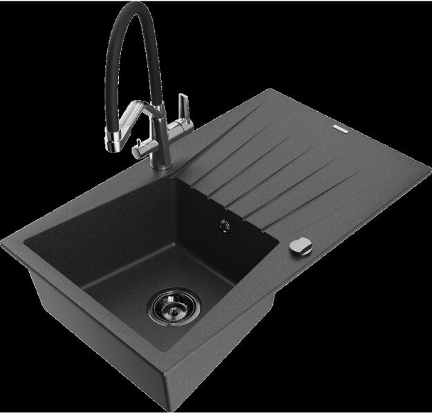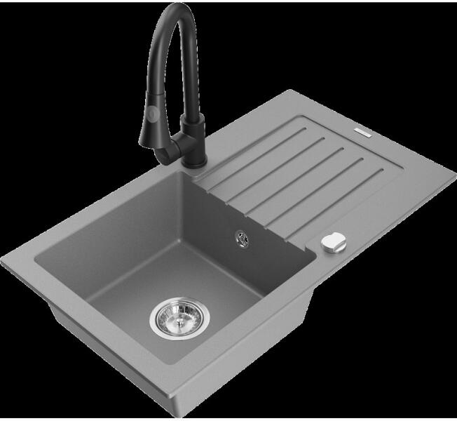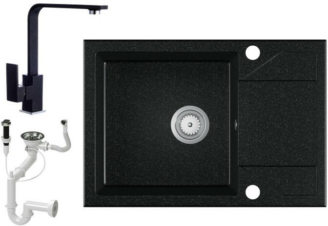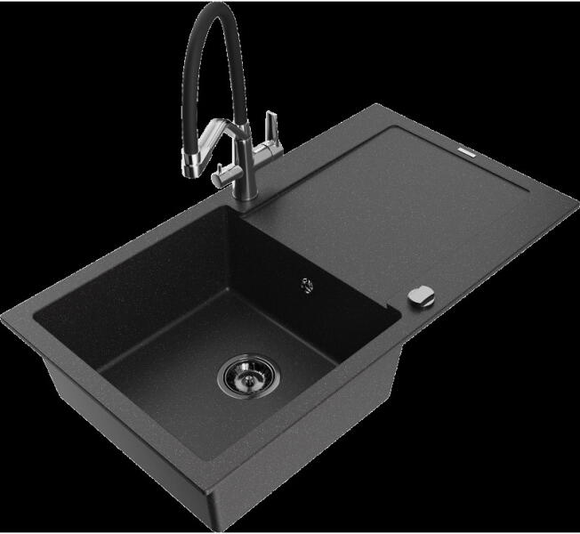 EOS Adria gránit mosogató szett szemcsés fekete színben. Teljes készlet, ami tartalmazza a dugóemelővel ellátott szifont szettet és egy modern megjelenésű, kerámia betétes csaptelepet. Méreténél fogva ideális lehet olyan konyhákba, ahol az okos helykihasználás lényeges, viszont szükséges a megfelelő méretű medence és csepegtető is CSOMAG TARTALMA: - Gránit mosogató -