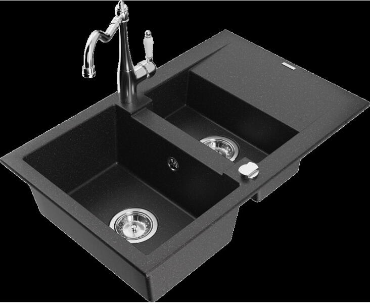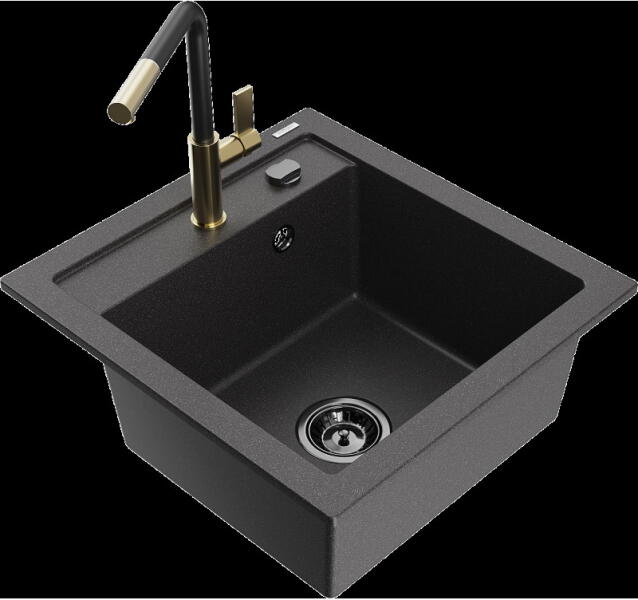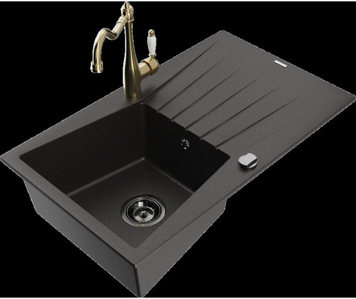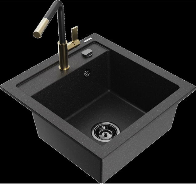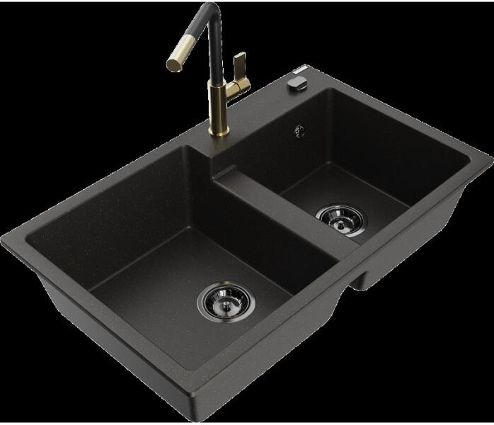 Mexen Tomas, gránit mosogató 800x500x190 mm, 2 kamrás és Telma króm csaptelep, fekete-arany metál, 6516-75-670200-00 A konyhai mosogató műszaki adatai: Gyártó: Mexen Sorozat: Tomas Modell: 2-kamrás csepptálca nélkül Felszerelés: munkalapra Szín: fekete - arany metál Felület: sima Hossza 800 mm Szélesség 500 mm Magasság: 190 mm Kamra mélysége: 180 mm (nagyobb), 180 mm (kiseb