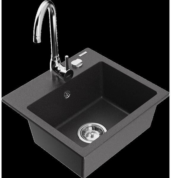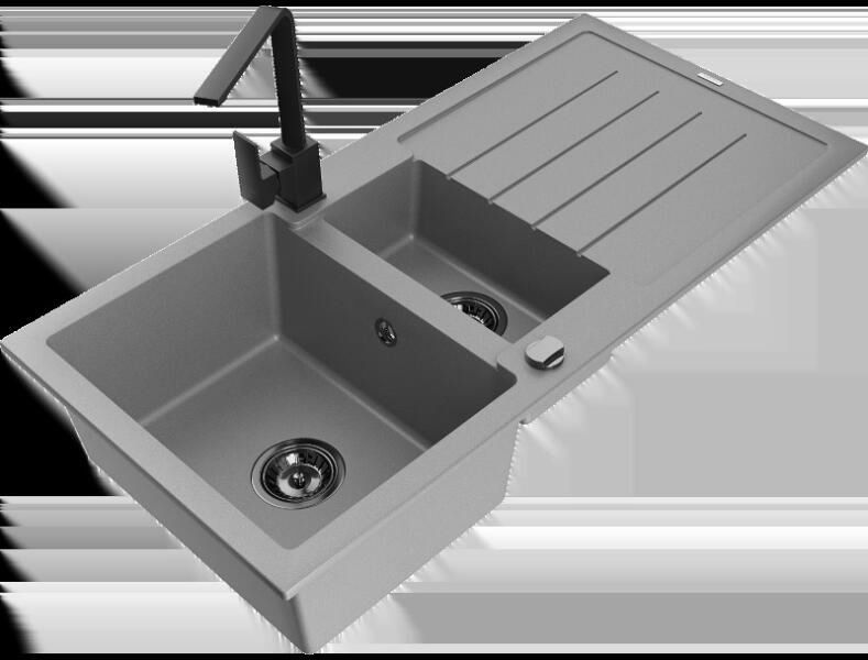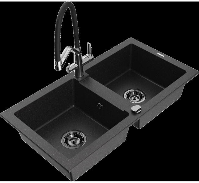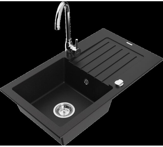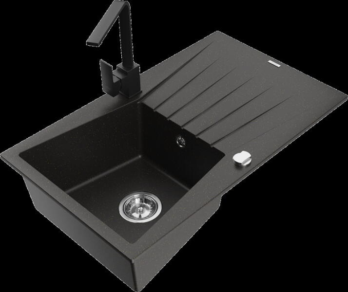 1.5 medencés szemcsés fekete gránit mosogató ami egyszerre kínálja a másfél medencés mosogatók előnyeit csepegtetővel, és a helytakarékos megoldást. Modern formavilág, letisztult, egyenes élek és ezáltal kissé szögletes megjelenés jellemzi, modern vagy minimál stílusú konyhákba ajánljuk. CSOMAG TARTALMA: - Gránit mosogató - Gamma Design csaptelep - Szifon készlet (mos