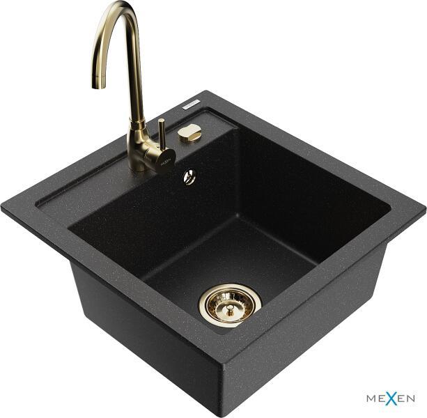 Mexen Vito, 1 kamrás gránit mosogató 520x490x210 mm, Telma arany csaptelep, fekete-ezüst metál, 6503-73-670200-50 Mosogató: Mérete: 520x490x210 mm Kamra mélysége: 200 mm Kamra méretei: 410x360 mm Lefolyó átmérője: ø90 mm Típus: 1 kamrás Típus: Az asztallapba süllyesztett Szín: fekete - ezüst metál Anyaga: gránit (80% gránit adalékanyag 20% gyanta) Túlfolyó nyílás: Igen