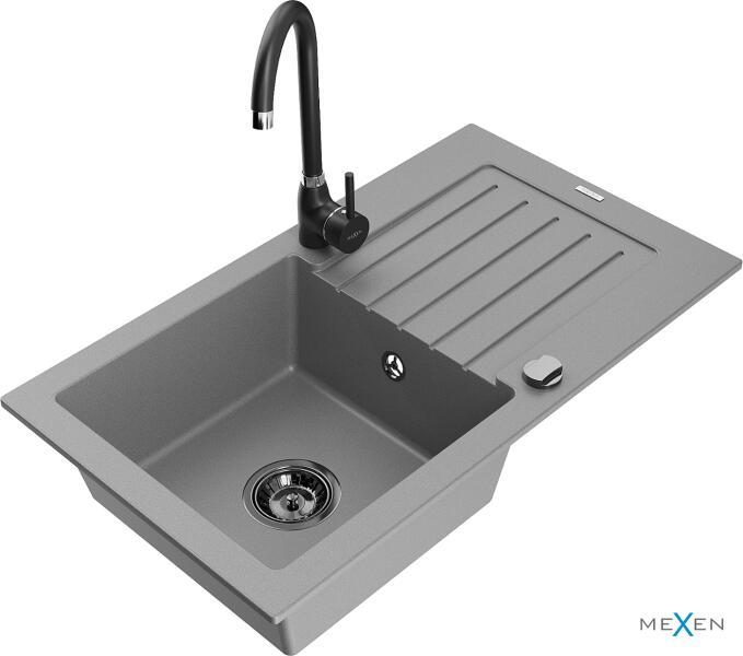 Mexen Pablo, gránit mosogató 752x436x161 mm, 1 kamrás és fekete Telma csaptelep, szürke, 6510-71-670200-70-B Gyártó: Mexen Sorozat: Pablo Mérete: 752x436x161 mm Kamra mélysége: 151 mm Kamra méretei: 356x332 mm Lefolyó átmérője: ø90 mm Szín: szürke Típus: 1 kamrás csepegtetővel Típus: az asztallapba ágyazva Anyaga: gránit (80% gránit adalékanyag 20% gyanta) Túlfolyó lyu