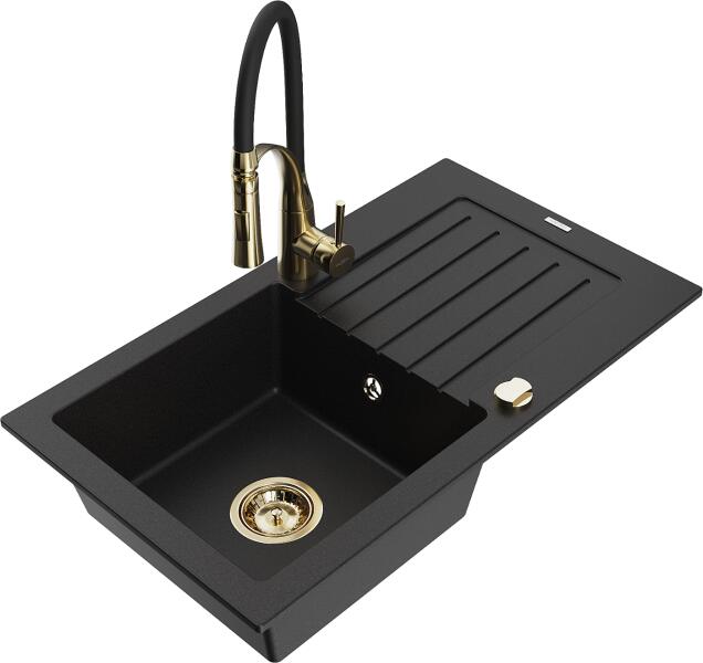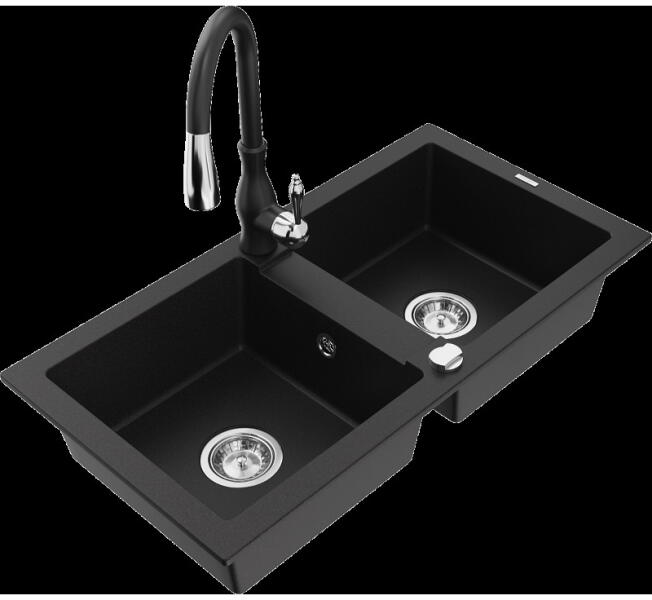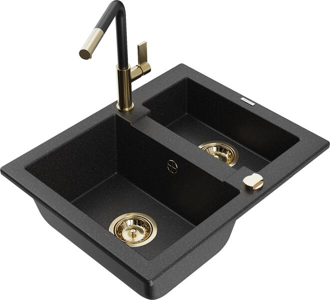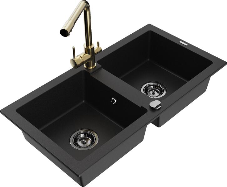 Mexen Mario, 2-kamrás gránit mosogató 820x436x161 mm és Duero arany mosogató csaptelep, fekete, 6504-77-671600-50-B Gyártó: Mexen Sorozat: Mario Termékkód: 6504822000-77 Fekete szín Mérete: 820x436x161 mm Kamra mélysége: 151 mm Kamra méretei: 356x336 mm Lefolyó átmérője: ø90 mm Típus: 2 kamrás Típus: a pultba süllyesztve Anyaga: gránit (80% gránit adalékanyag 20% gyanta)