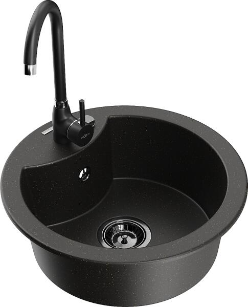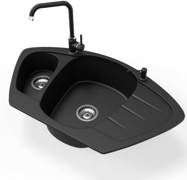 NERO Compact sarok gránit mosogató, ami egyben praktikus és impozáns látványelem is a konyhában. Tökéletes választás azokba a konyhákba, ahol a mosogató rész a sarokban lett kialakítva. Íves, de modern formatervezése nagyszerűen illik bármilyen stílusú konyhába. A mosogatón 2 lyuk lett kialakítva, egy a csaptelepnek és egy a beépíthető mosogatószer adagolónak vagy aut