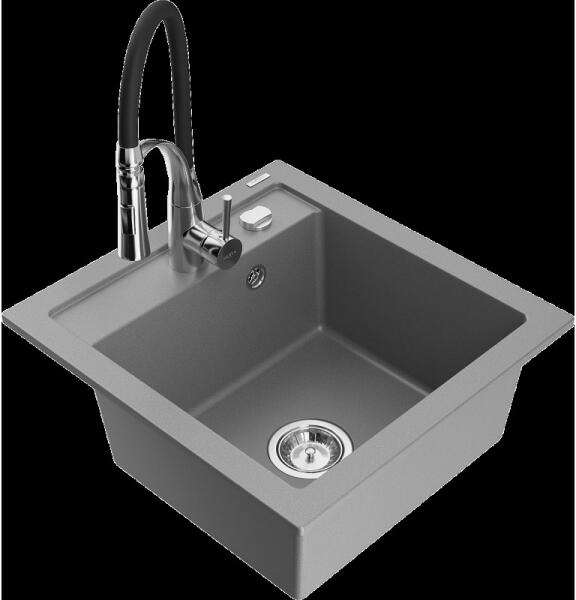 Milo konyhai mosogató: Gyártó: Mexen Méretek: 435x410x171 mm Kamra mélysége: 161 mm Kamra méretei: 375x280 mm Lefolyó átmérője: ø90 mm Típus: 1 kamrás Beépítés: felülről a pultba süllyesztve Anyaga: gránit (80% gránit adalékanyag 20% gyanta) Túlfolyó lyuk: igen Lyukak: 2 (1 x akkumulátor, 1 x automatikus leeresztő csavar vezérlés) Nagy ellenállás a karcolásokk