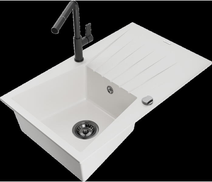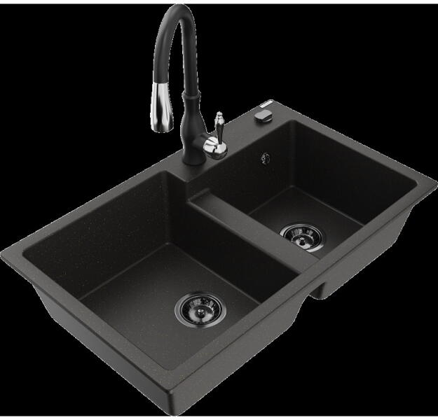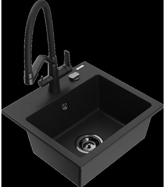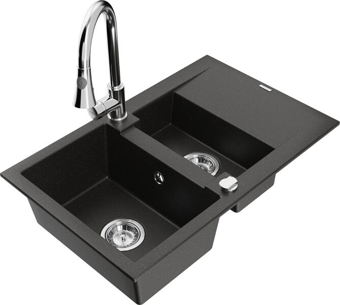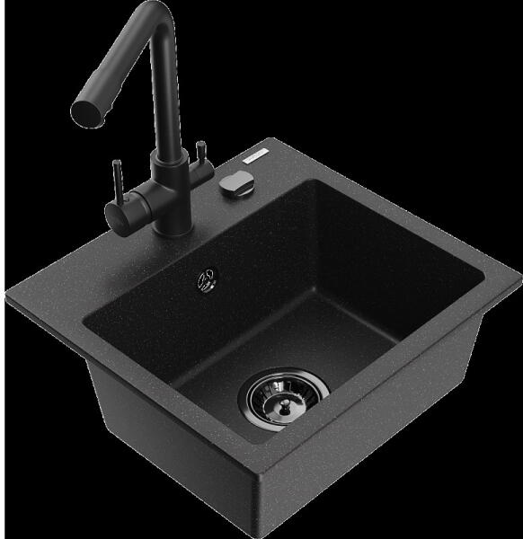 1 medencés, gránit mosogató csepegtetővel, csapteleppel|Kivitelezés: fekete|Beszerelési mód: süllyesztett|Minimális szekrényszélesség: 500 mm|Hosszúság: 580 mm|Szélesség: 440 mm|Magasság: 164 mm|Mosogatógép-csatlakozással ellátott szerelvényekkel felszerelt mosogató|Automatikus lefolyóelzárással ellátott szifonok|Fekete színű csaptelep|Csaptelep típusa: egykaros, keve