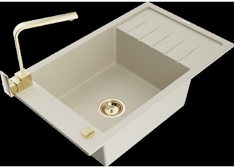 Mexen Pablo, gránit mosogató 752x436x161 mm, 1 kamrás és arany csaptelep Rita, fehér, 6510-20-670300-50 Gyártó: Mexen Sorozat: Pablo Mérete: 752x436x161 mm Kamra mélysége: 151 mm Kamra méretei: 356x332 mm Lefolyó átmérője: ø90 mm Fehér szín Típus: 1 kamrás csepegtetővel Típus: az asztallapba ágyazva Anyaga: gránit (80% gránit adalékanyag 20% gyanta) Túlfolyó lyuk: igen