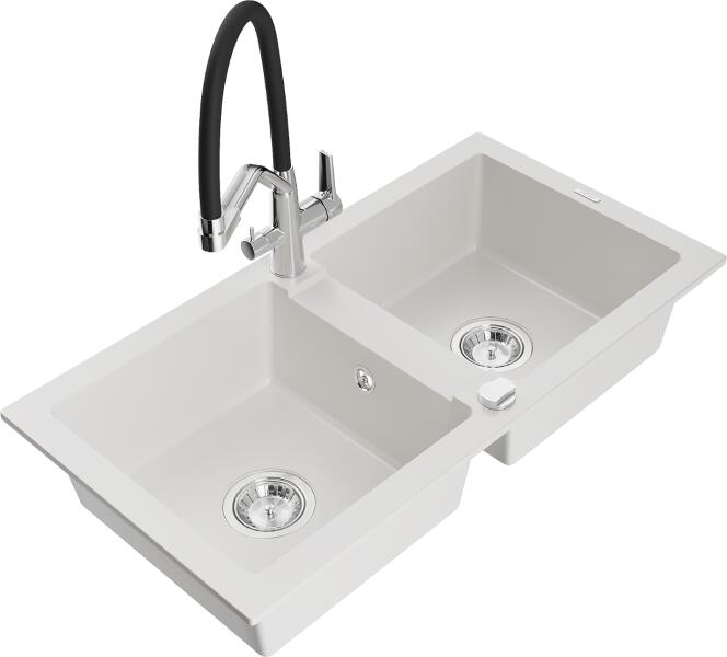 Mexen Mario konyhai mosogató: Méretek: 820x436x161 mm Kamra mélysége: 151 mm Kamra méretei: 356x336 mm Lefolyó átmérője: ø90 mm Típus: 2 kamrás Típus: felülről az asztal munkalapjába süllyesztve Anyaga: gránit (80% gránit adalékanyag 20% gyanta) Túlfolyó lyuk: igen Lyukak: 2 (1 x mosogató csaptelep, 1 x automatikus leeresztő csavar vezérlés) Nagy ellenállás a karc