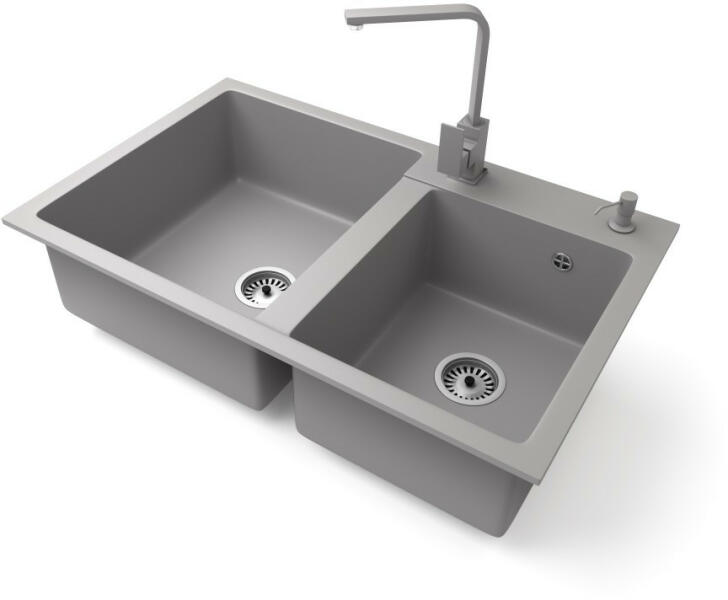 NERO Palazzo gránit mosogatótálca szürke színben csapteleppel és adagolóval. A kétmedencés mosogatótálcák 21. századi csúcsmodellje, ami két nagyméretű medencéjével és különleges kialakításával minden konyha tökéletes eleme lehet. Az asszimetrikus kialakításnak köszönhetően a kisebb medence fölött egy praktikus perem helyezkedik el, ahol helyet kapott a csaptelep.