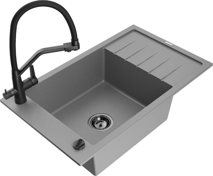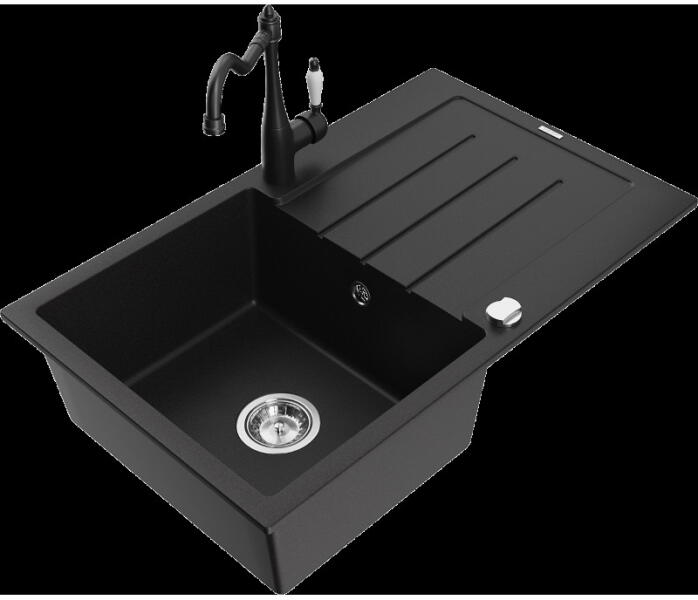 Elias konyhai mosogató, 795x480x200 mm, 1 kamrás Gyártó: Mexen Sorozat: Elias Típus: 1 kamrás, rövid csepegtetővel Méretek: 795x480x200 mm Kamra mélysége: 190 mm Kamra méretei: 465x420 mm Lefolyó átmérője: ø90 mm Beépítés: felülről a munkalapba süllyesztve Anyaga: gránit (80% gránit adalékanyag 20% gyanta) Túlfolyó lyuk: igen Lyukak: 2 (1 x akkumulátor, 1 x autom