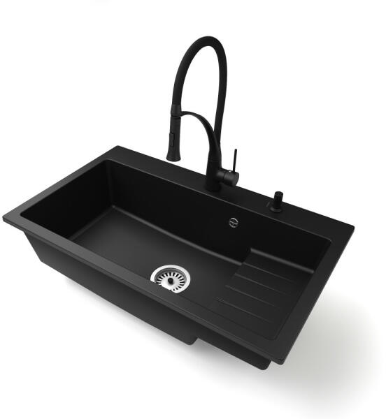 Nero Grande gránit mosogató, ami egyszerre modern és látványos, valamint tökéletesen kihasználható nagyobb edények tisztítására is. A nagyméretű 46.5 x 42 cm-es (emellett 20 cm mély) medence mellett egy csepegtető rész is kialakításra került, mindez úgy, hogy nem vesz el jelentős helyet a konyhai munkafelületből. Modern megjelenésű, letisztult szögletes formavilág jell