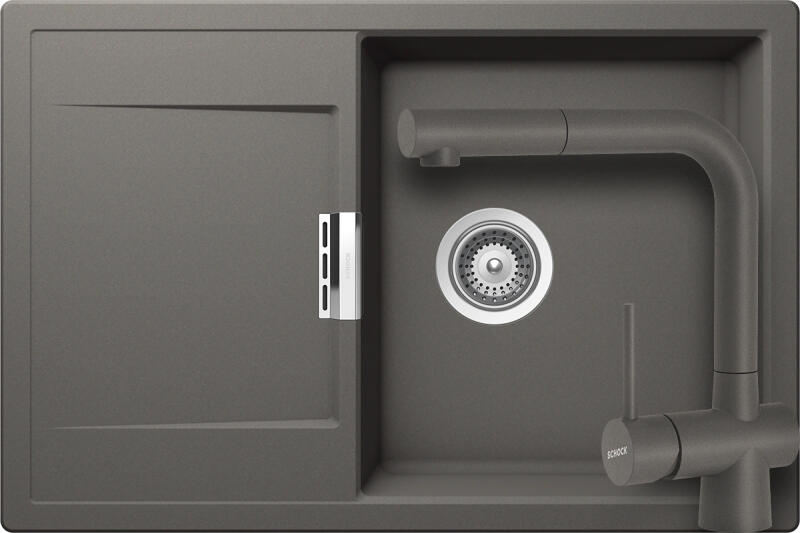 Schock Mono D-100 konyhai mosogatótálca Cristadur Silverstone 765 x 510 mm, gránit, megfordítható, hagyományos beépítés, sötétszürke munkalapba beépíthető, egymedencés, csepegtetővel ellátott, ideálisan illeszkedik a minimum 50 cm-es alsószekrényhez. A mosogatótálca megfordítható, a csaptelep helye előre elkészített, könnyedén áttörhető. A csomagban találja a hasz