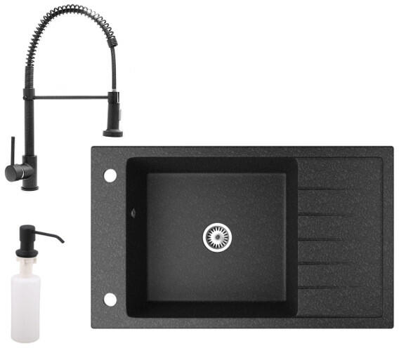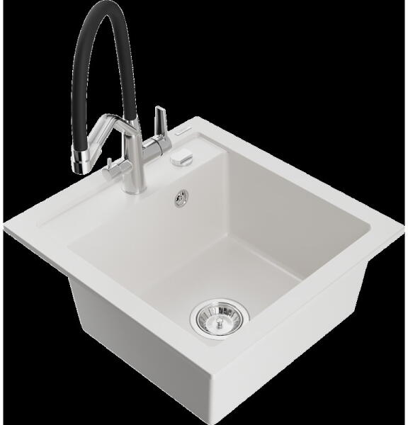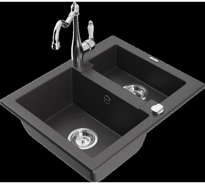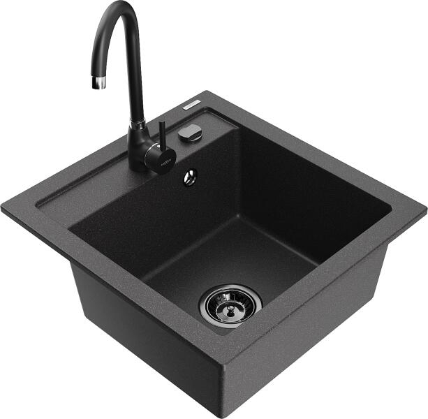 Mexen Vito, 1 kamrás gránit mosogató 520x490x210 mm, fekete matt Telma csaptelep, fekete, 6503-76-670200-70-B Mosogató: Mérete: 520x490x210 mm Kamra mélysége: 200 mm Kamra méretei: 410x360 mm Lefolyó átmérője: ø90 mm Típus: 1 kamrás Típus: Az asztallapba süllyesztett Fekete szín Anyaga: gránit (80% gránit adalékanyag 20% gyanta) Túlfolyó nyílás: Igen Lyukak: (akkumulátor,