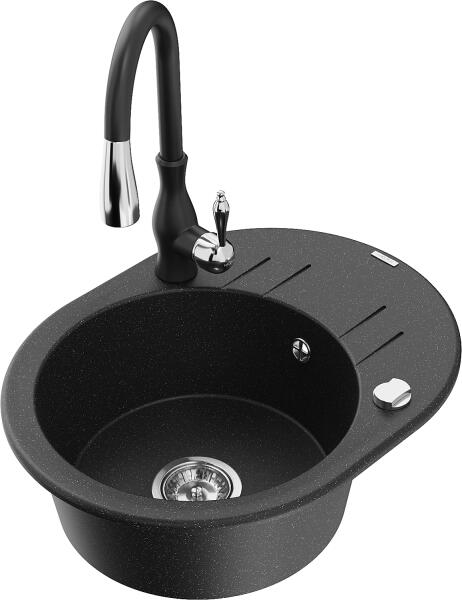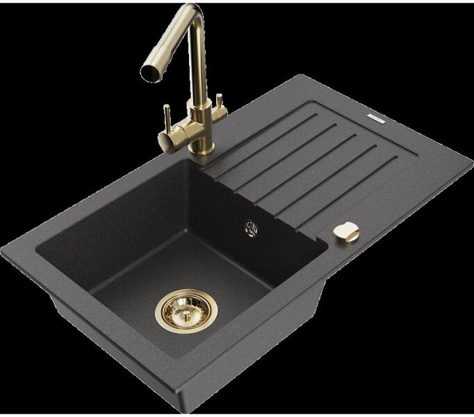 Mexen Vito, gránit mosogató 490x520x210 mm, 1 kamrás és mosogató csaptelep Carla, fekete, 6503-77-670700-70 Vito konyhai mosogató: Méretek: 520x490x210 mm Kamra mélysége: 200 mm Kamra méretei: 410x360 mm Lefolyó átmérője: ø90 mm Fekete szín Típus: 1 kamrás Típus: a pultba való beágyazáshoz Anyaga: gránit (80% gránit adalékanyag 20% gyanta) Túlfolyó lyuk: igen Lyukak: 2 (