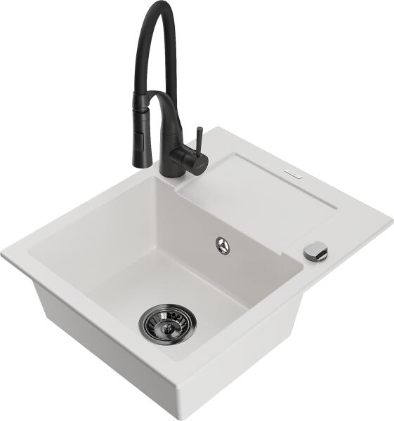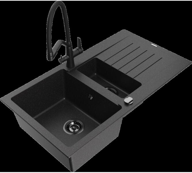 Mexen Enzo konyhai mosogató: Gyártó: Mexen Sorozat: Enzo Modell: 1 kamrás Beépítés: felülről a munkalapba süllyesztve Méretek: 576x465x174 mm Kamra mélysége: 164 mm Kamra mérete: 395x320 mm Lefolyó átmérője: 90 mm Szifon + automatikus leeresztő csavar Anyaga: gránit (80% gránit - kő, 20% gyanta) Sima felület a könnyű tisztítás érdekében: igen Megnövelt ellenállás az
