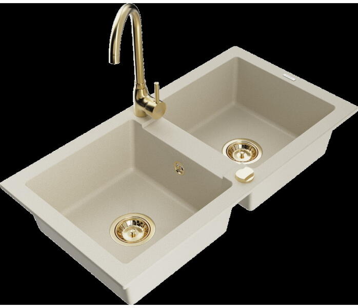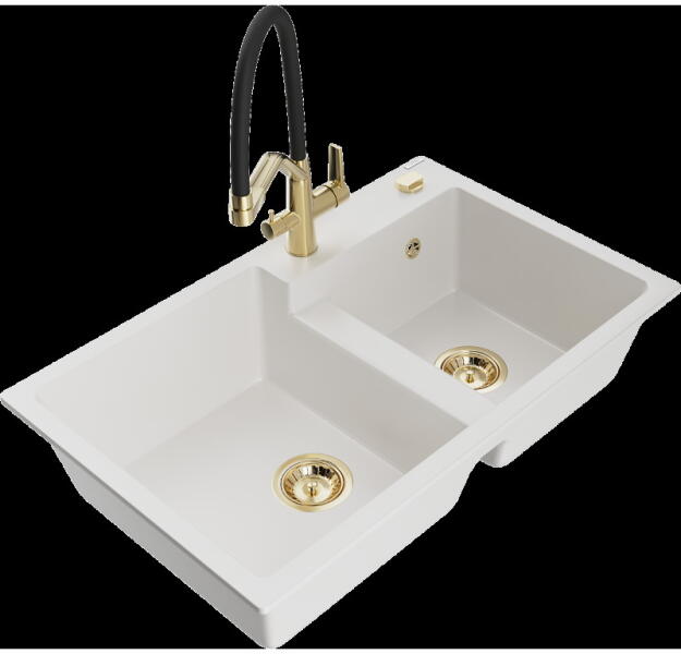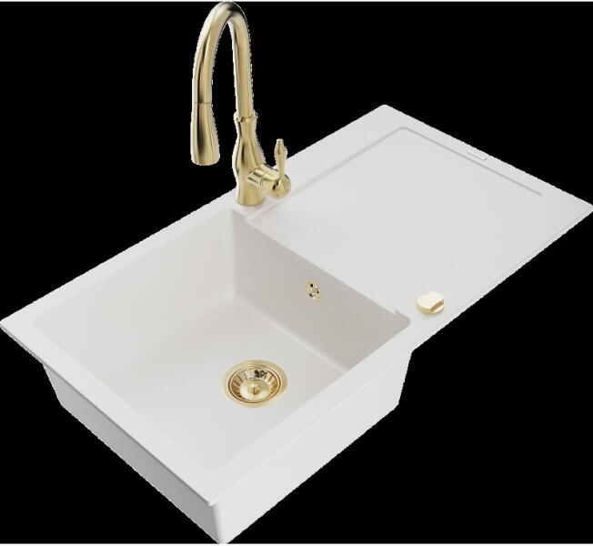 Mexen Vito, 1 kamrás gránit mosogató 520x490x210 mm, Rita arany csaptelep, fehér, 6503-20-670300-50 Mosogató: Mérete: 520x490x210 mm Kamra mélysége: 200 mm Kamra méretei: 410x360 mm Lefolyó átmérője: ø90 mm Típus: 1 kamrás Típus: Az asztallapba süllyesztett Fehér szín Anyaga: gránit (80% gránit adalékanyag 20% gyanta) Túlfolyó nyílás: Igen Lyukak: (akkumulátor, gép) 2