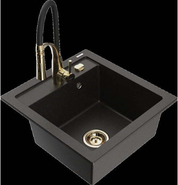 Mexen Diego, 1 rekeszes gránit mosogató 488x488x167 mm, arany szifon, arany fényes csaptelep Rita, fekete, 6512-77-670300-50 Gyártó: Mexen Sorozat: Diego Modell: 1 kamrás Felszerelés: munkalapra Fekete szín Felület típusa : sima Hossza 488 mm Szélesség 488 mm Magasság: 167 mm Kamra mélysége: 157 mm Kamra mérete: 406 mm Lefolyó átmérője: 90 mm Szifon + automatikus leeresztő An