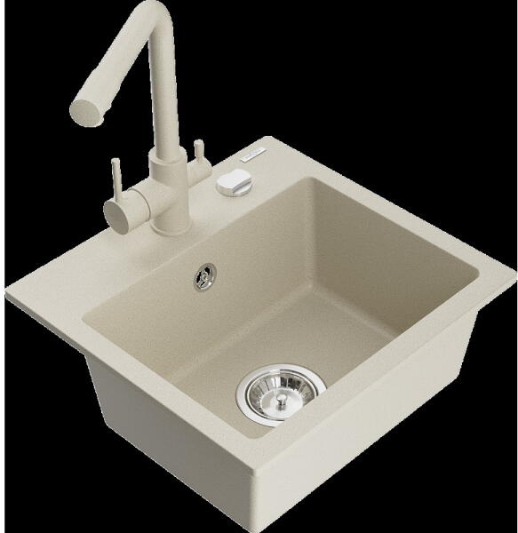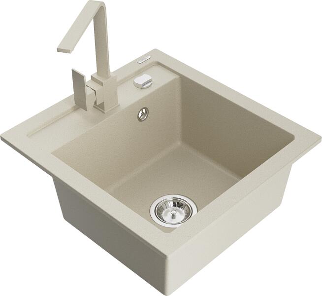 Mexen Vito, 1 kamrás gránit mosogató 520x490x210 mm, Rita bézs csaptelep, bézs, 6503-69-670300-69 Mosogató: Mérete: 520x490x210 mm Kamra mélysége: 200 mm Kamra méretei: 410x360 mm Lefolyó átmérője: ø90 mm Típus: 1 kamrás Típus: Az asztallapba süllyesztett Szín: bézs Anyaga: gránit (80% gránit adalékanyag 20% gyanta) Túlfolyó nyílás: Igen Lyukak: (akkumulátor, gép) 2 N